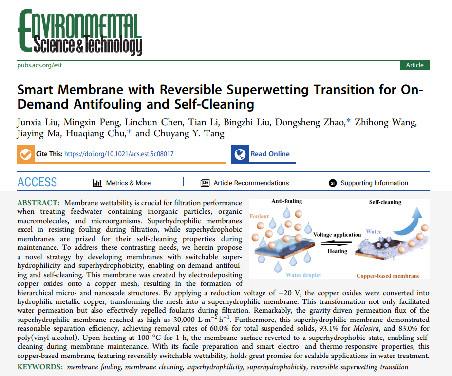 近日,我院市政工程专业彭铭鑫、陈霖纯(指导老师柳君侠)在环境领域顶刊(Environmental Science & Technology)以“Smart Membrane with Reversible Superwetting Transition for On-Demand Antifouling and Self-Cleaning”为题发表最新研究成果。论文基于智能仿生理念,提出构建“超亲水/超疏水”智能转换来按需实现膜“抗污染/自清洁”,研究成果为膜法水处理中膜污染的高效控制提供新思路。