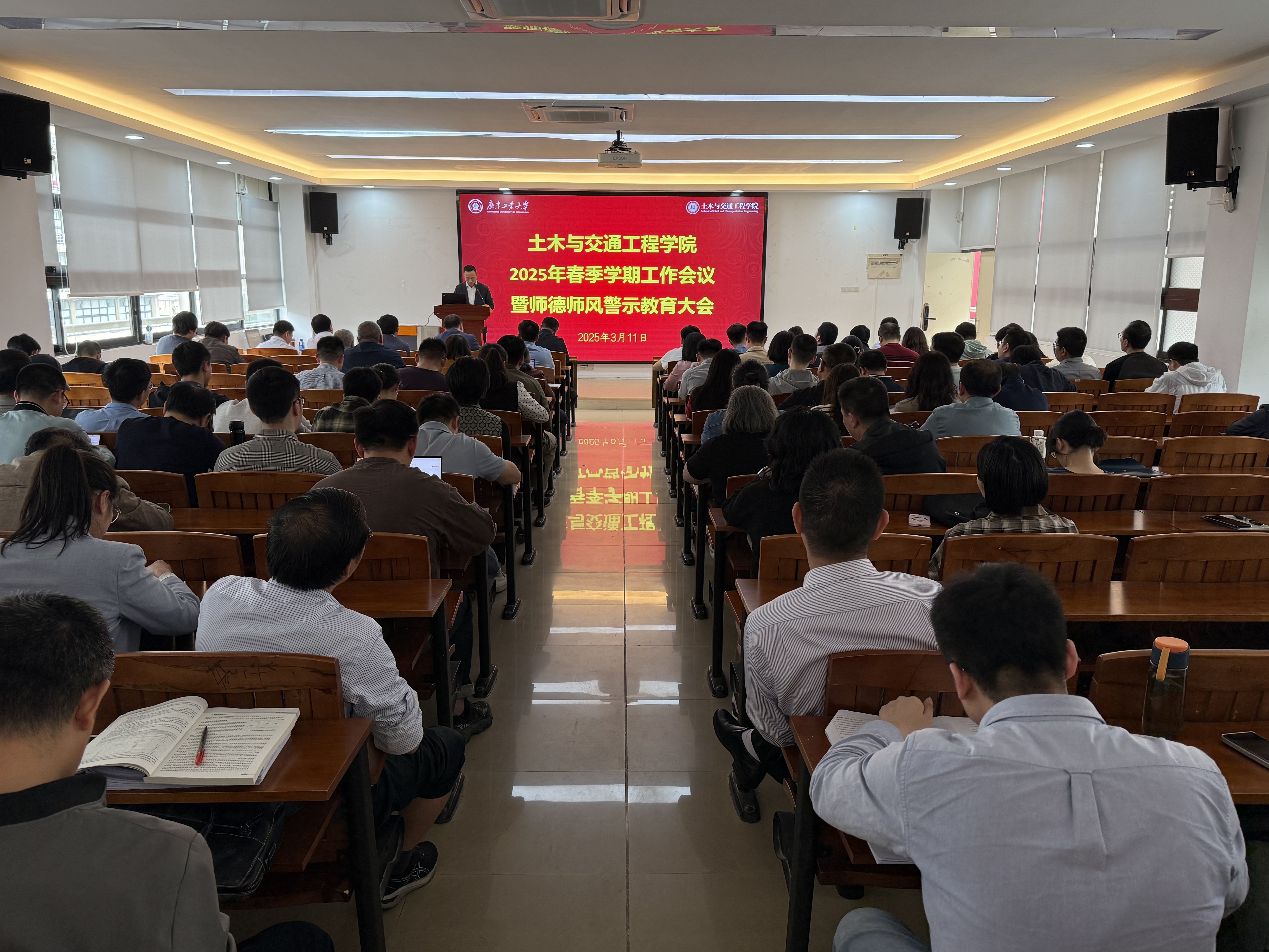 在实验2号楼520会议室召开2025年春季学期工作会议暨师德师风警示教育大会,会议由学院党委书记周建强主持,全体教职工参加。