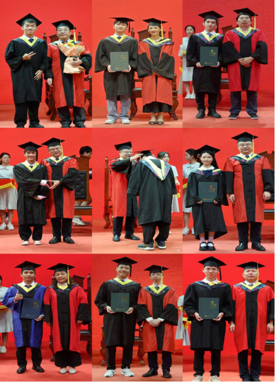 在庄重的音乐中, 7位主礼教授为2023届毕业学子拨穗正冠、颁授学位,鞠躬、握手、合影,定格为一张张写满笑意、充满喜庆的照片。