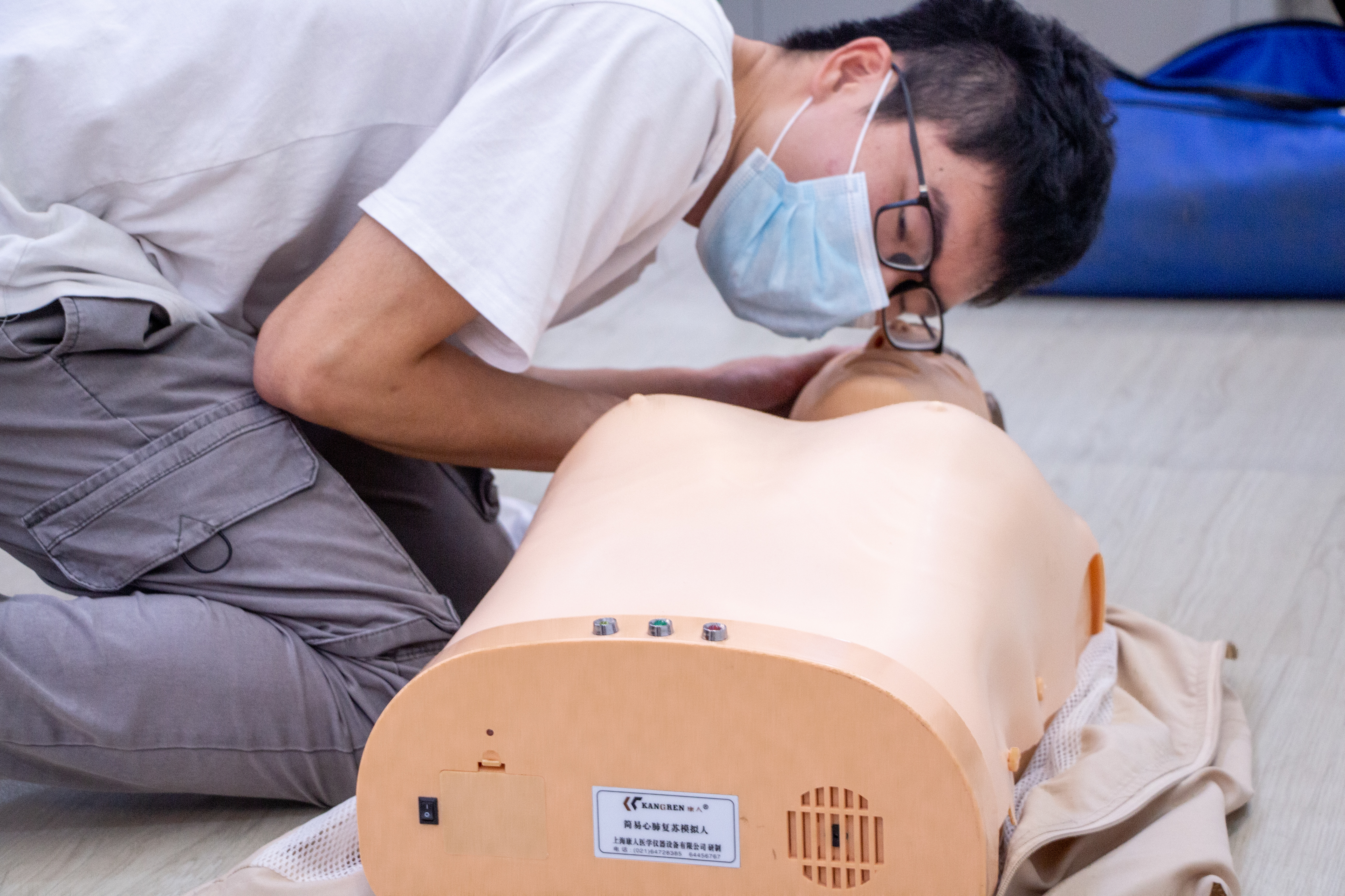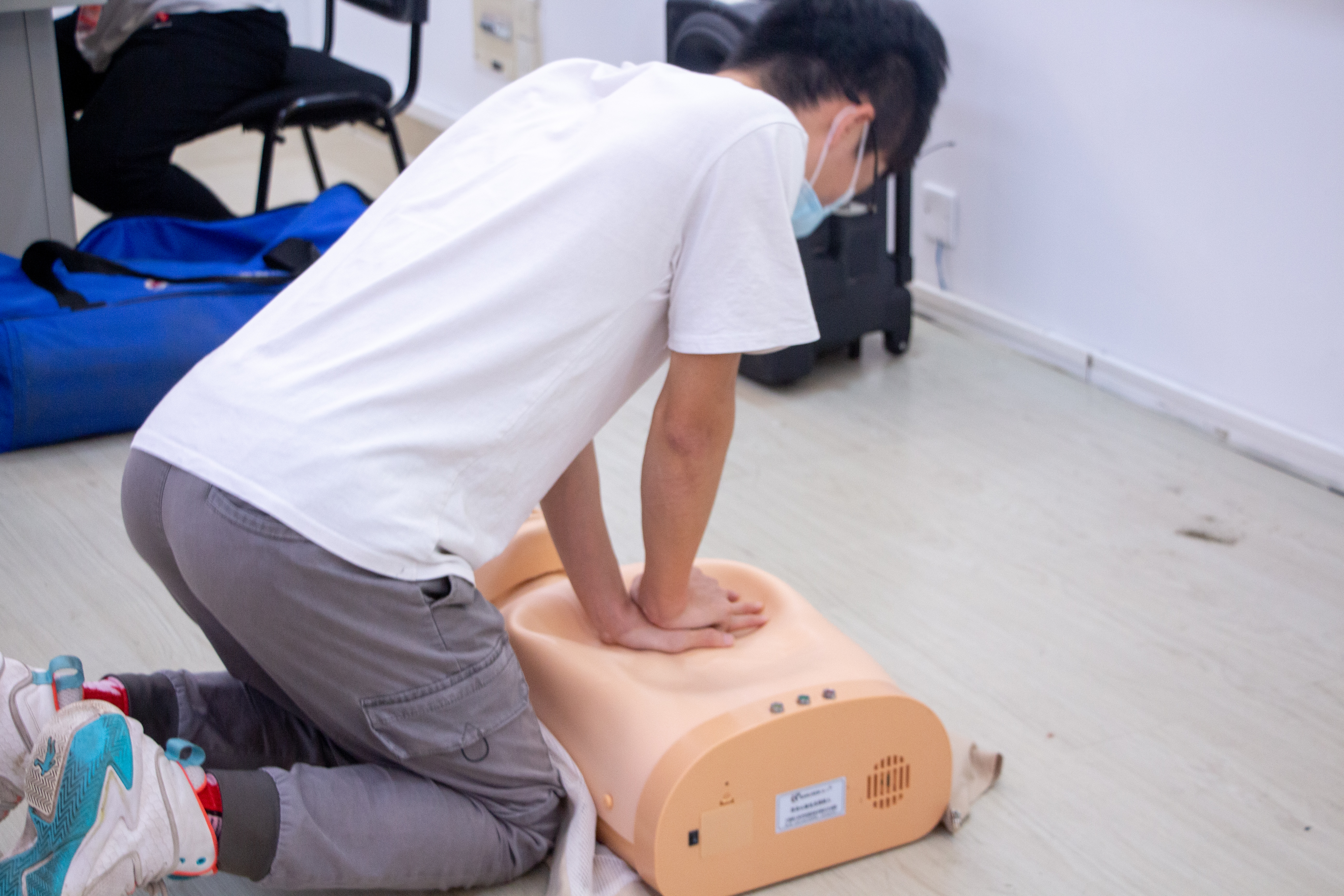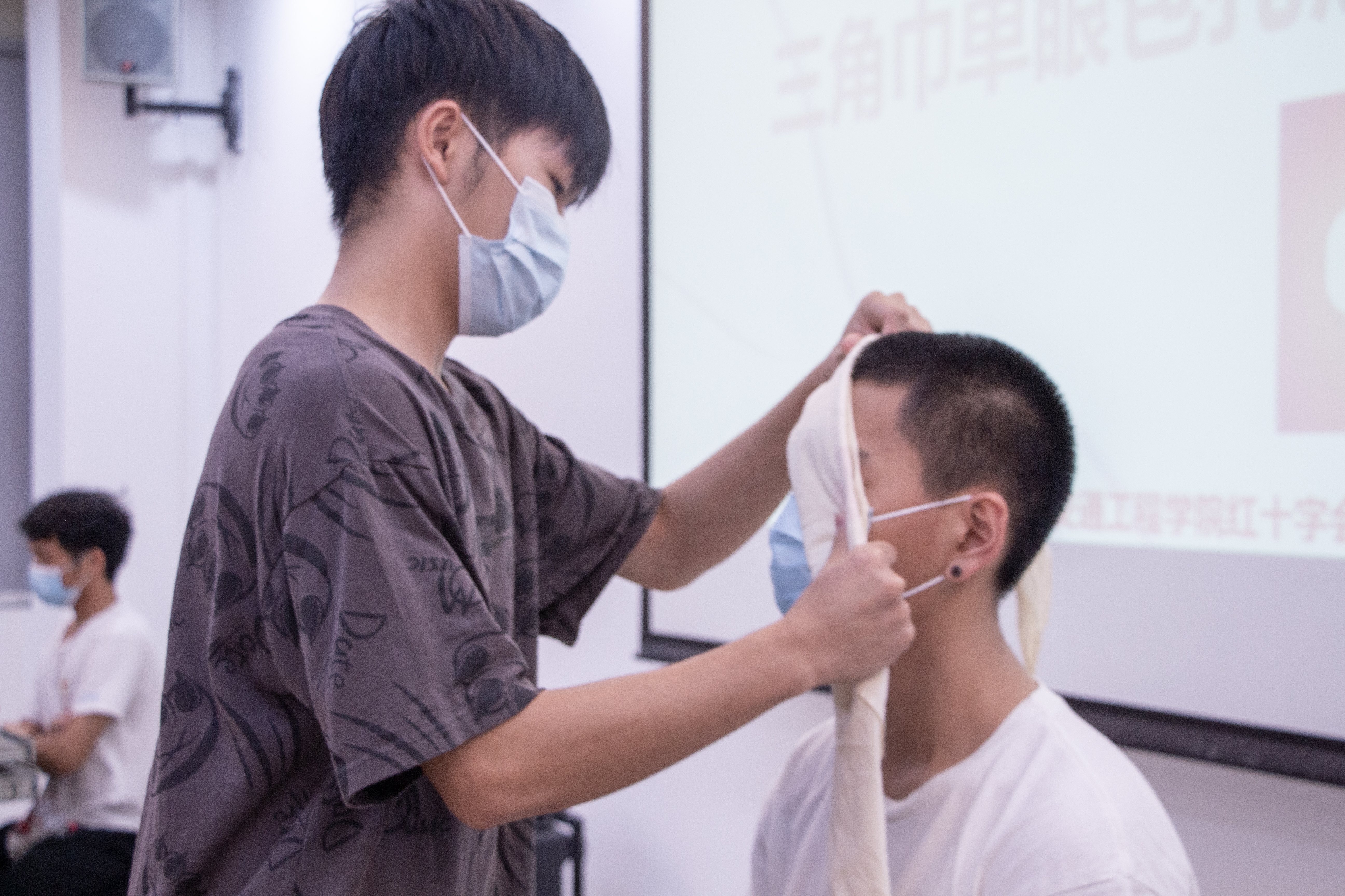 本次竞赛还加强了同学们的实操能力。在实操环节中,每支队伍轮流上台进行实操,一人讲解,其余队员进行演示。多支队伍向我们演示了如何进行CPR心脏复苏的同时,还分别展示了“三角巾单眼包扎法”、“三角巾双眼包扎法”、“三角巾手部包扎法”等包扎方法。负责讲解的选手耐心且细致地为大家讲解每一个动作的规范和要领,选手们展现出了各自的风采,包扎技能娴熟,实力旗鼓相当。观众们也受益匪浅。
