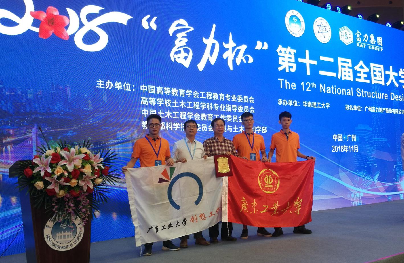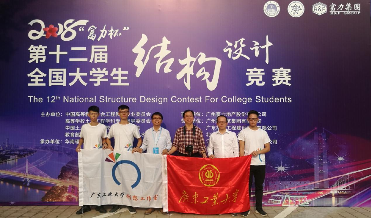 2018年11月8日至11日,“富力杯”第十二届全国大学生结构设计竞赛在华南理工大学举行。本届竞赛采取在各省(市)分区赛后选拔优秀队伍参加全国总决赛的全新组织模式,分区竞赛吸引清华大学、上海交通大学、浙江大学、同济大学等共计542所高校、1236支参赛队参与其中,参赛师生高达10000余人次,并由此产生了107所高校108支参赛队伍进入全国总决赛,是竞赛历届规模最大、参赛队伍最多的一次比赛,参赛队伍的整体实力明显上升,相比以往竞争更为激烈。我院派出1支代表队参赛。在师生的共同努力下,广东工业代表队获得全国三等奖的好成绩。