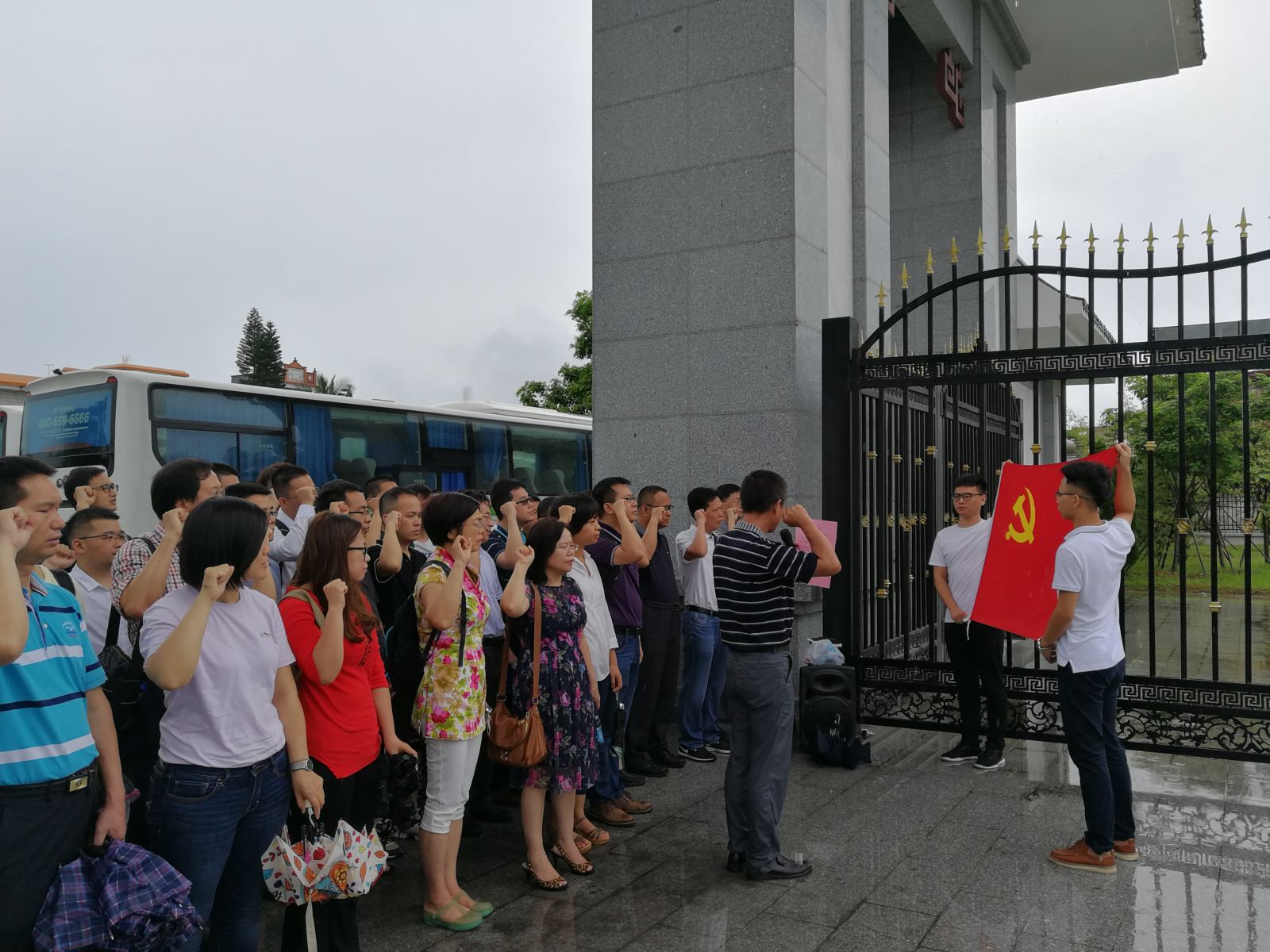 在周文雍、陈铁军烈士陵园,全体成员肃立,向革命烈士默哀致敬。学院举行了党性教育现场教学,由学院党委宣传委员何嘉年讲述两位烈士的革命事迹。周文雍、陈铁军是我党早期的地方干部,因崇高的共产主义理想并肩作战,为革命事业作出了杰出的贡献,并在共同的革命生涯中产生了爱情。他们因叛徒出卖而被敌人逮捕。直至为党的事业献身的最后时刻,他们决定将埋藏心底的爱情公布于众,在敌人的刑场上举行了革命者的婚礼,英勇就义。“头可断,肢可折,革命精神不可灭”,革命先烈用热血和生命,表达了坚定的理想信念和英勇不屈的斗争精神。党员同志在烈士纪念碑前重温入党誓词,重温庄严承诺和坚定决心,在党旗下接受心灵的净化和洗礼。