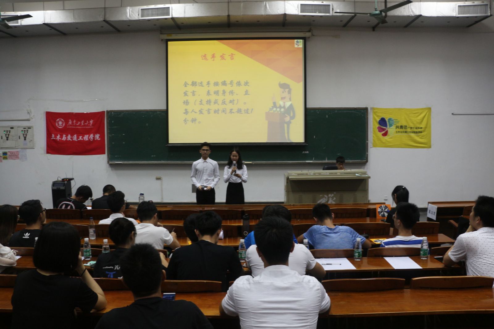 团委在大学城校区教三102教室举办了第十一期“土木•青年说”活动。学院团委书记杨刚老师和书记处彭健桐师姐、黄华鸿师兄、黄招娜师姐、彭泽鑫师兄以及学院辩论队林心薇师姐等人作为嘉宾、评委参加了活动。