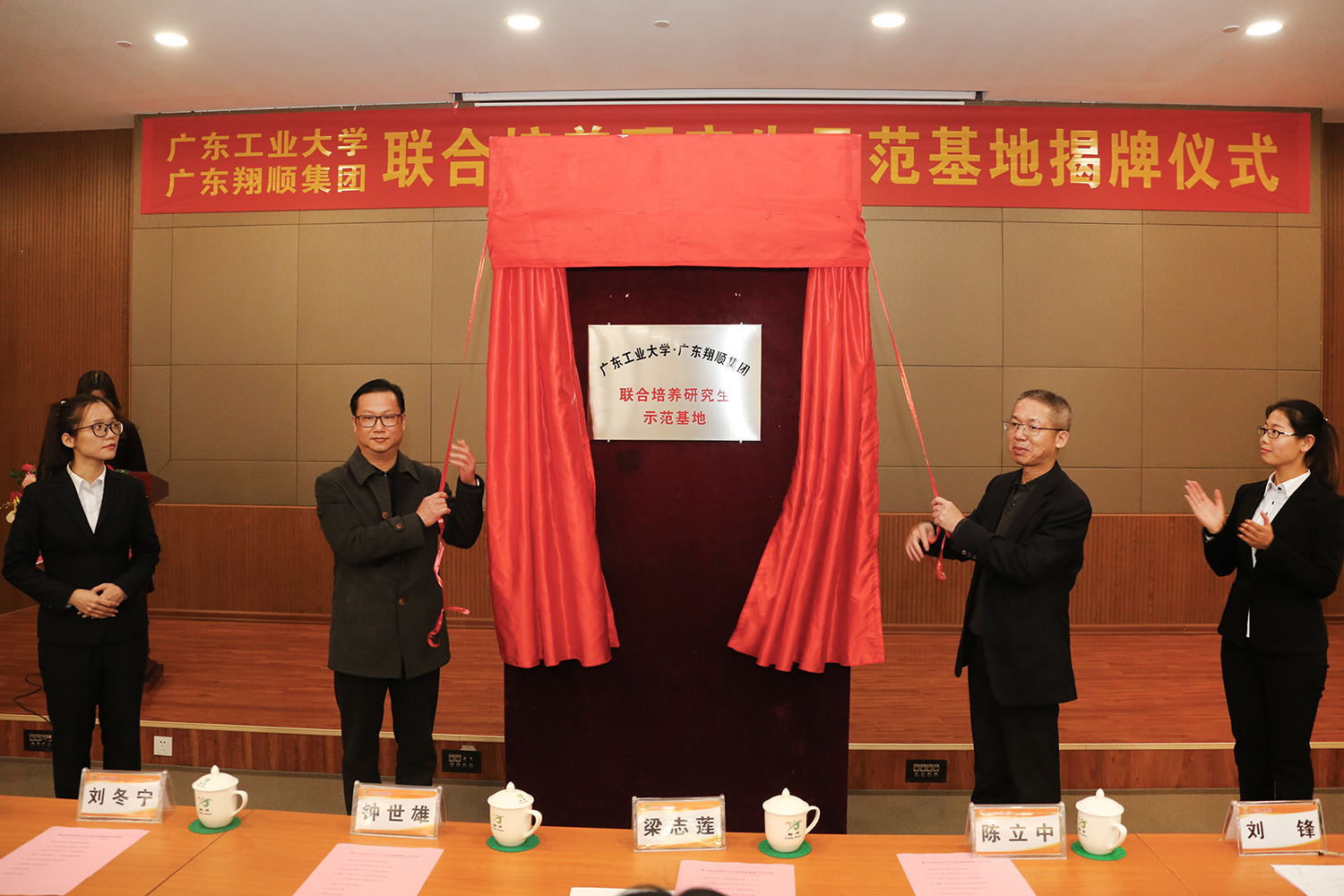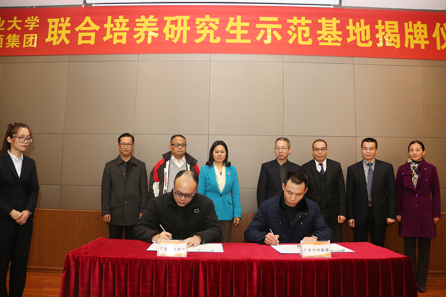 研究生院刘冬宁副院长与总裁助理陈涛代表校企双方签订了“联合培养研究生协议书”,陈立中副校长、翔顺集团常务副总裁钟世雄代表校企双方进行揭牌。