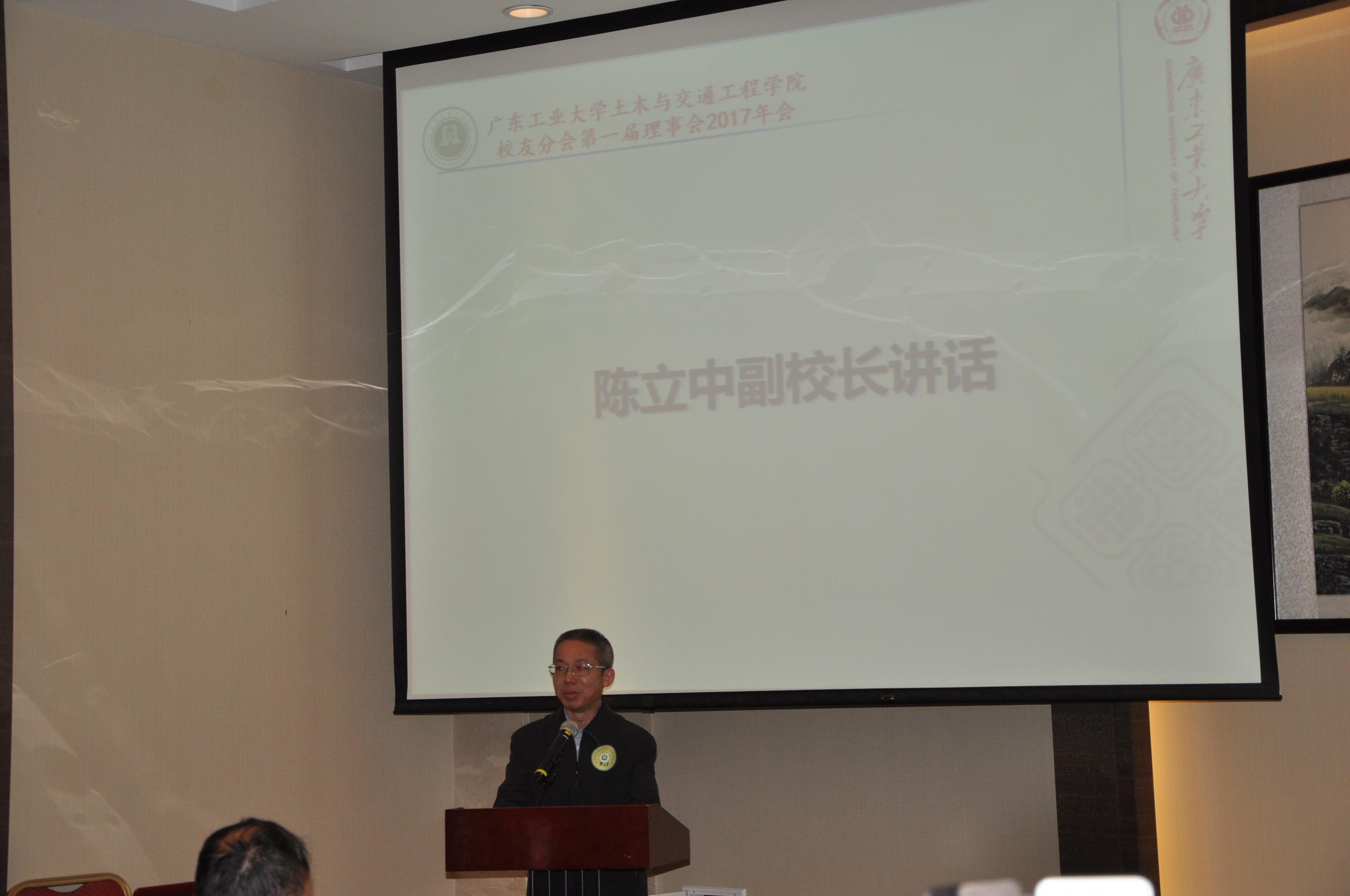 陈立中副校长代表学校向学院校友分会理事会年会的召开表示祝贺,对学院校友分会所做的工作表示感谢。陈立中副校长认为本次校友分会理事会年会有三个特点,第一是理事会年会能够得到这么多校友的关注和支持,有来自全省15个地级市的校友代表参加;第二是校友们的发言别具一格、别出心裁、单刀直入、直奔主题;第三是校企之间的合作越来越多、越来越紧密。陈立中副校长代表学校祝贺校友们在各行各业取得的成果,同时介绍了学校取得的新成绩和在高水平大学建设进程上的成果。陈副校长希望学校有关部门、各学院要思考落实如何守护广工大,如何更好地服务校友,这既是工作的大课题,又是实实在在的具体事务;希望各部门共同参与到明年60周年校庆的筹备工作,为每一位校友谋得实实在在的福利,切实做到校友有所呼,母校有所应。陈副校长热忱地欢迎广大校友常回家看看,相聚2018年。