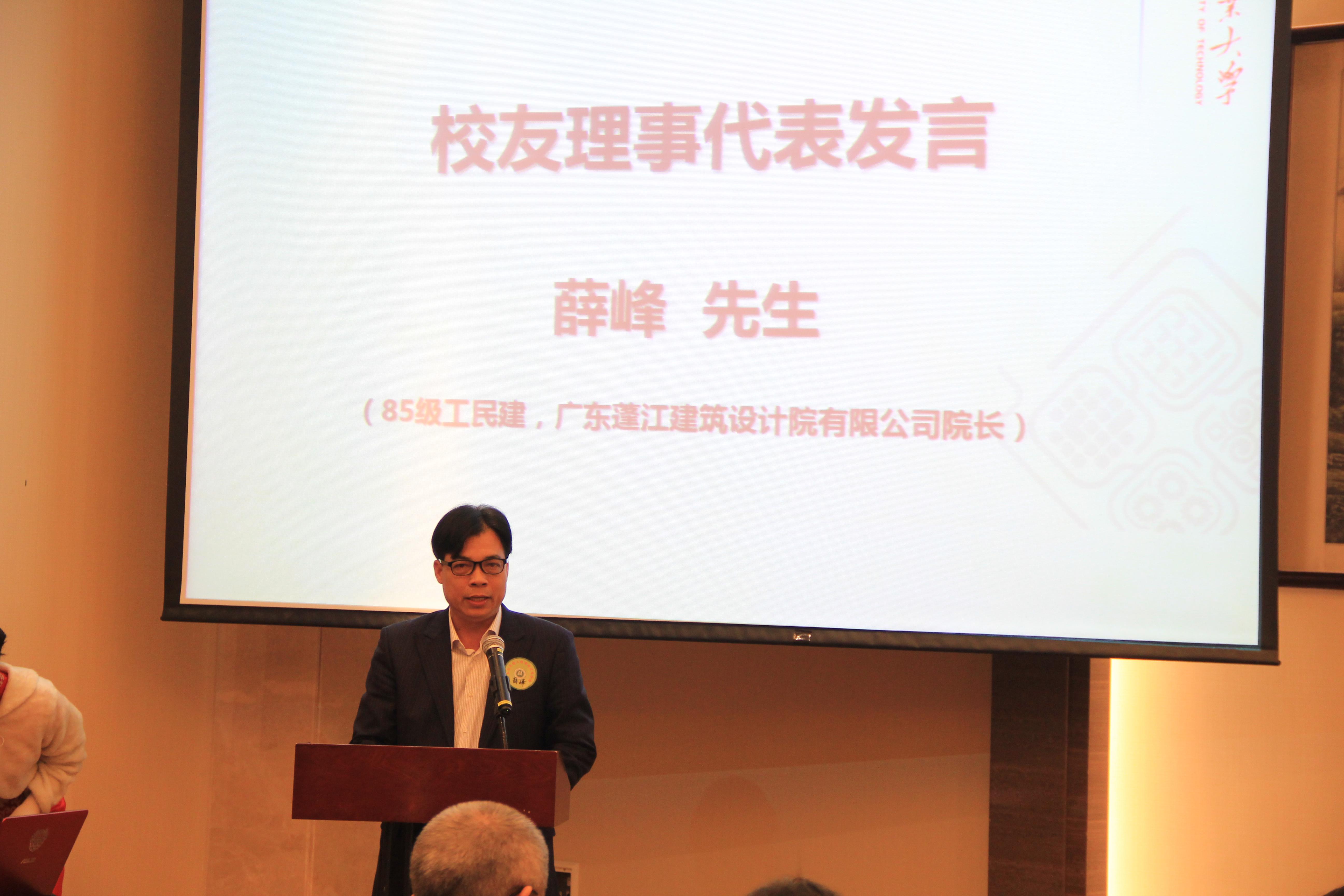 85级工民建专业、广东蓬江建筑设计院有限公司院长薛峰,86级路桥专业、广州新玖峰投资管理有限公司董事长梁桥,99级工程管理专业、广东正远建筑安全科技有限公司总经理郭兰锐,作为校友代表分别发言,感谢母校的培养的同时也对校友分会的发展提出了宝贵的建议和意见。