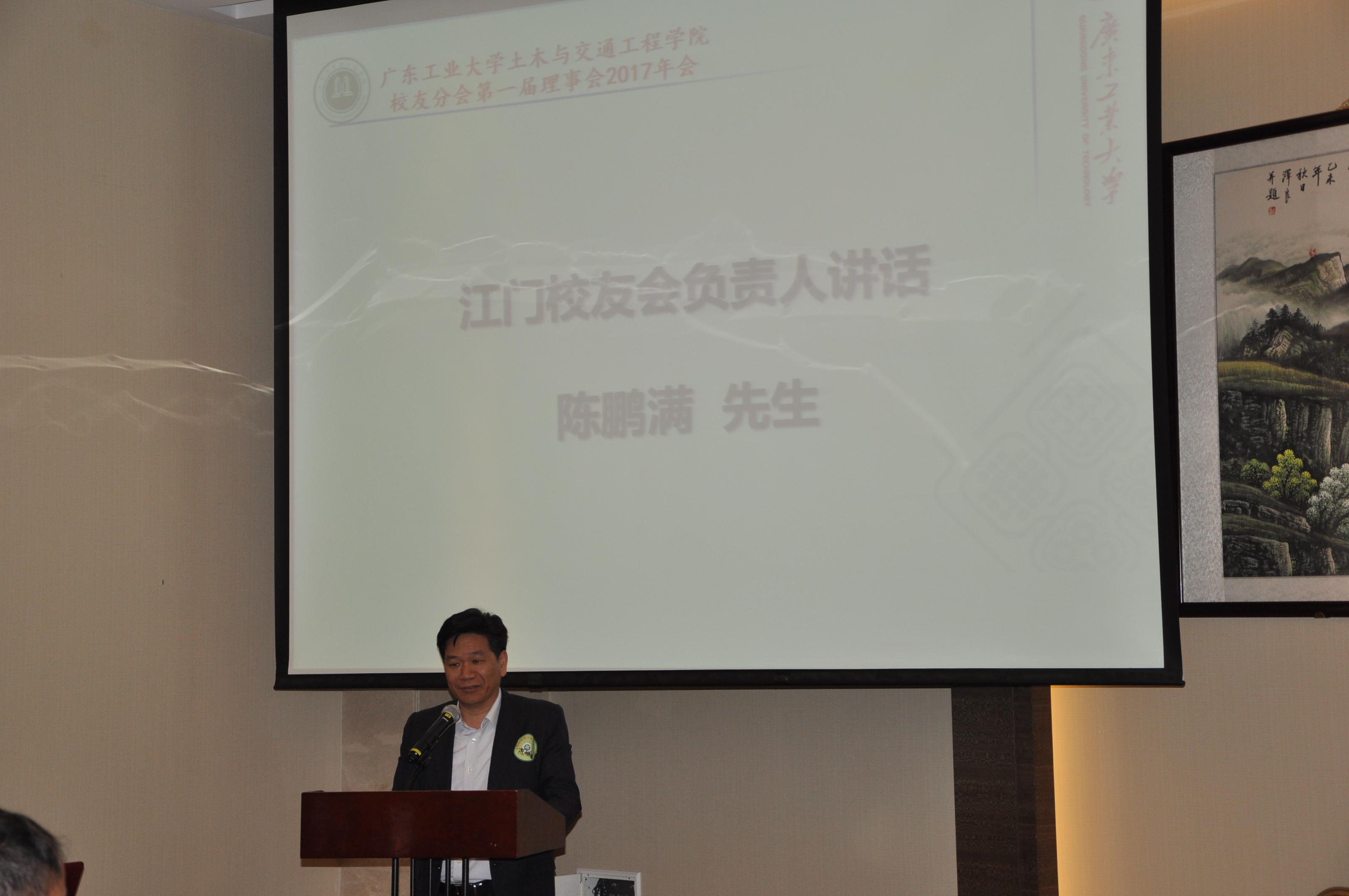 江门校友会会长陈鹏满讲话,他首先对本次理事会年会在江门召开表示感谢和热烈欢迎各地校友,同时他指出江门的许多路桥楼舍凝聚着校友们的智慧与汗水。最后他表示在今后的工作中,要积极组织校友联谊活动,帮助校友获得更好发展。他也感谢母校对江门校友会工作的支持。