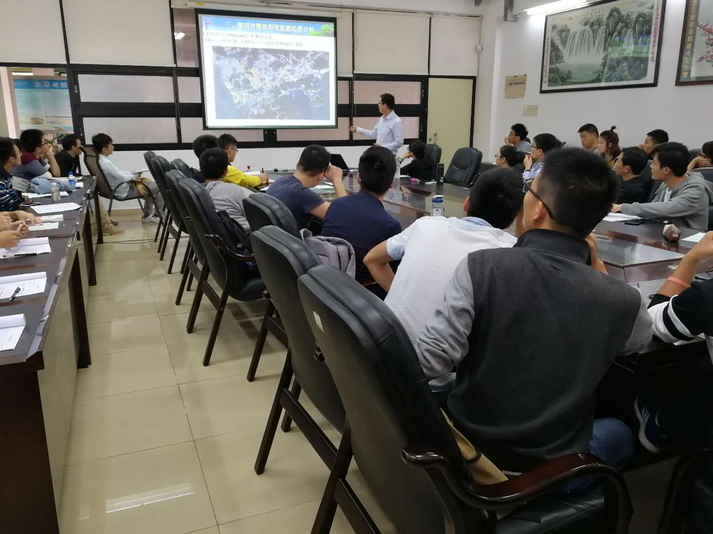 胡波副教授首先介绍了合成孔径雷达干涉测量(InSAR)技术的原理,然后以厦门、深圳为例详细介绍了课题组利用InSAR技术对大面积区域进行全面监测,搜索整个目标区域的地质灾害点,以及利用现有数据分析目标变化的趋势性信息,发现新的地质灾害区域,在潜在灾害的预警提供数据支持及为灾害治理效果的评定领域所做的研究。最后展望了InSAR技术的发展趋势和在城市健康化管理中的应用前景。讲座结束后胡波副教授与现场师生就InSAR技术与岩土工程结合探究地面下沉原因,永久散射点的设定,InSAR技术的稳定性和数据共享等问题等跟与会者进行了热烈讨论和交流。