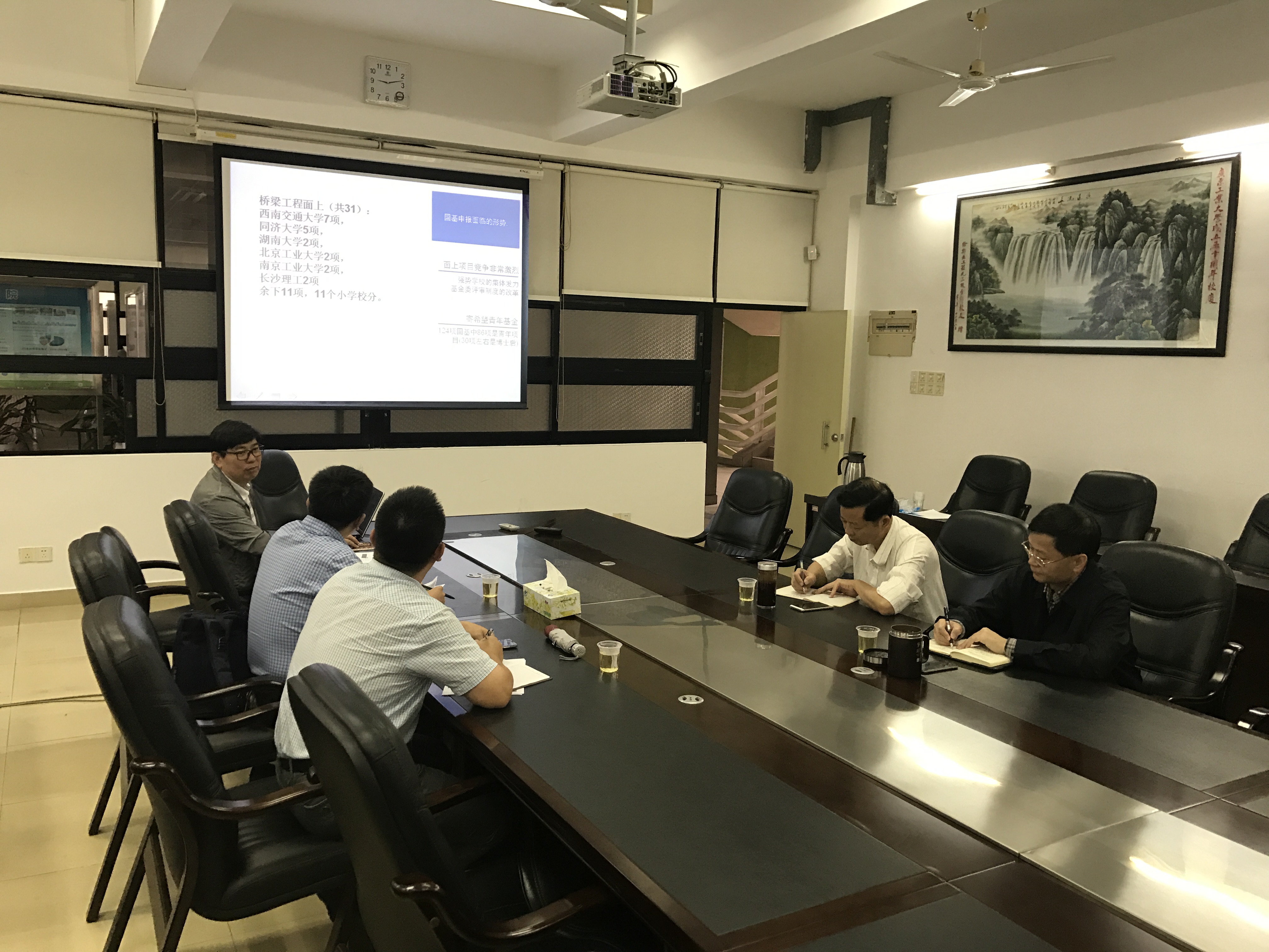 科技处陈辉副处长提出应该充分调动青年教师的国基申报的积极性,让他们在申报工作中找到乐趣。也应该注意动员广大老师联合外聘人员进行国基申报。并对学院提出的困难和建议做了部分回应和解答。陈辉科长介绍了国基申报的新形势和新政策,鼓励青年教师多进行学术交流。