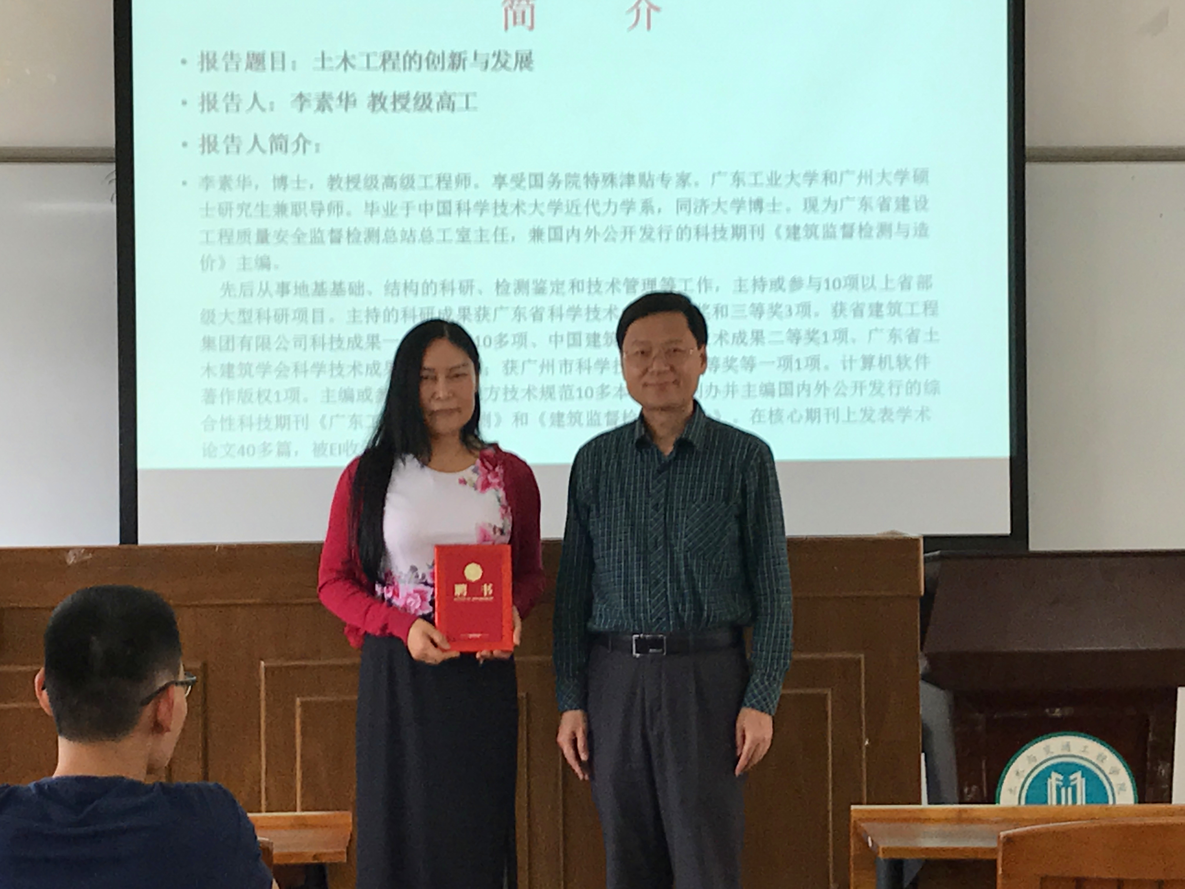 2017年5月23日下午,我院第5期土木论坛----“土木工程的创新与发展”在实验二号楼520举行。本次论坛特邀了享受国务院特殊津贴专家、广东省建设工程质量安全监督检测总站总工室主任、我校硕士研究生校外导师李素华教授级高工作题为“土木工程的创新与发展”的讲座。论坛由疯AV