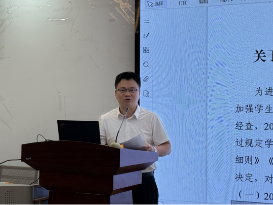 随后,学院党委副书记陈颂坚针对目前学院部分学生违规使用实验仪器、无故旷课累计超过规定学时等问题,通报批评了相关师生,重申了加强实验室安全及规矩意识、严肃课堂纪律、建设优良学风的迫切性,并提出了相关工作要求。