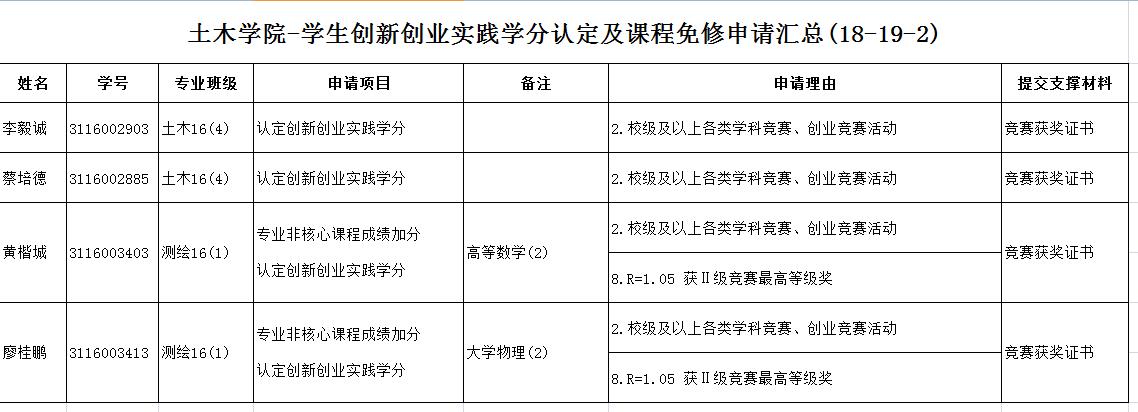 根据教务处《关于做好2018-2019学年度第二学期本科生申请创新创业实践学分认定及课程加分、免修等工作的通知》的精神,我院对照《疯AV 创新创业实践学分认定及课程免修实施暂行办法》对学生递交的申请进行初审,现公示如下。